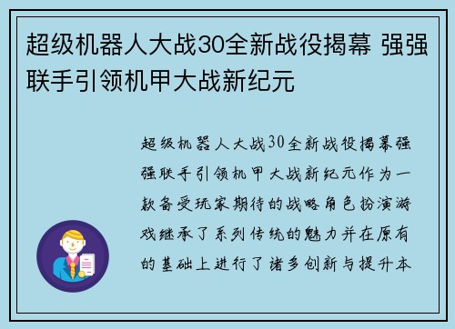 超级机器人大战30全新战役揭幕 强强联手引领机甲大战新纪元