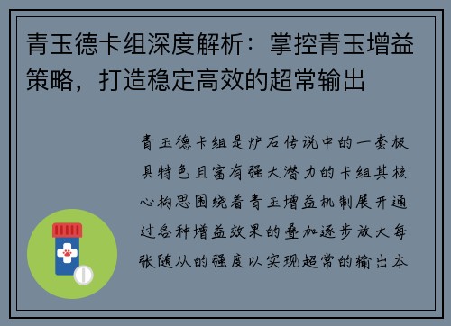 青玉德卡组深度解析:掌控青玉增益策略,打造稳定高效的超常输出