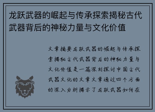 龙跃武器的崛起与传承探索揭秘古代武器背后的神秘力量与文化价值