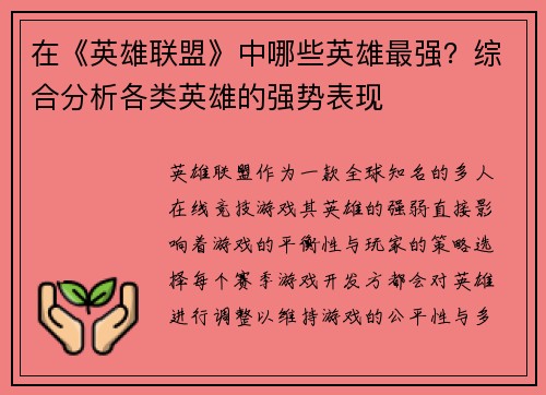 在《英雄联盟》中哪些英雄最强?综合分析各类英雄的强势表现